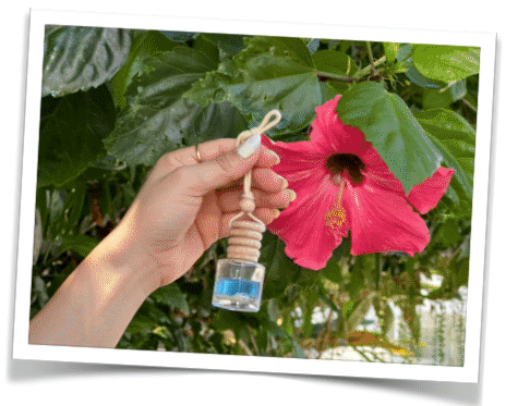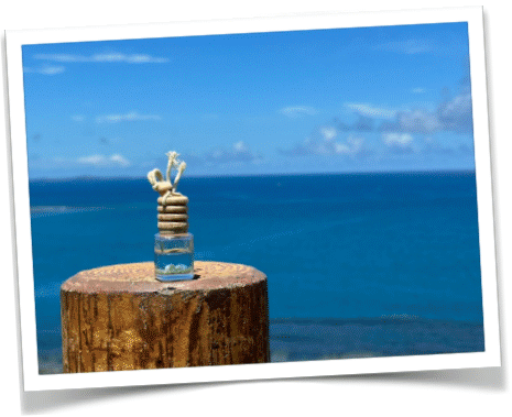ナチュラルデザインの小瓶と沖縄の海を想い起こさせる星砂・貝入りのマリンブルーで爽やかな香りの芳香剤。